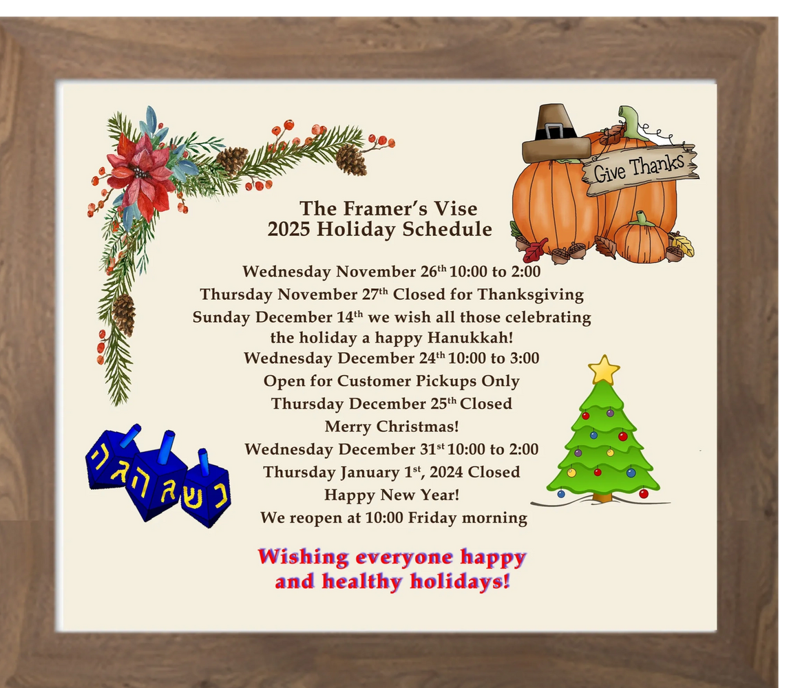 Experience and variety set The Framer’s Vise apart. Our framing specialists have art backgrounds and many years of experience. We offer over 2,000 options for frames and hundreds of styles, and colors, of matting. Specialty framing includes seamless acrylic, industrial metal, box mounting, and more.